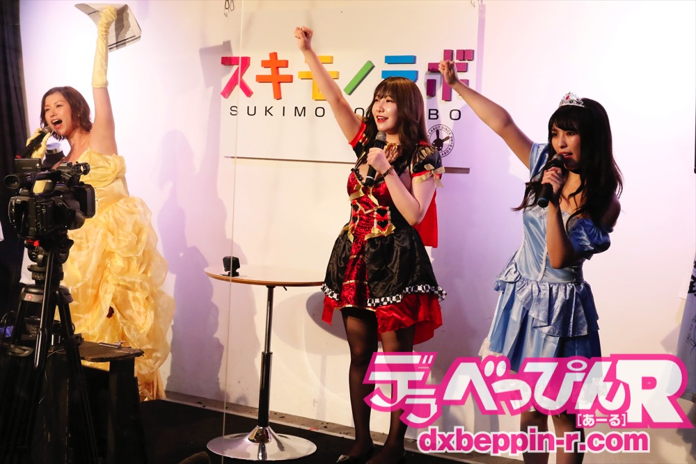 このスキモノラボは2012年7月から放送されているアダルトグッズ通販番組。本来はスタジオ収録されていますが公開イベントと合体。今回、公開収録に出演したセクシー女優は倉木しおりちゃん、若月みいなちゃん、加藤ツバキさんの3名。倉木しおりちゃんと若月みいなちゃんは初登場です。