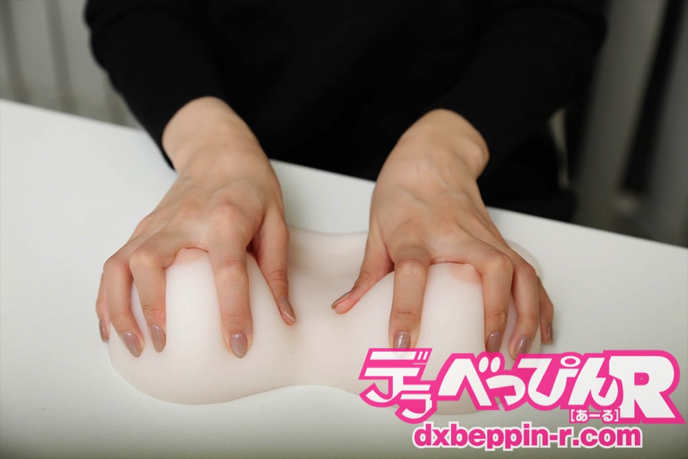 真中 これはオチ〇チン全体を包み込めるほどの大きさはないんです。だから、挟むというよりも谷間に擦りつける感じがいいのかなと。ローションをしっかり垂らして擦りつける感じですね。床や机に置いて擦りつけても、ちゃんと固定されているので、床オナじゃないですけど、そういう感覚でも使えます。